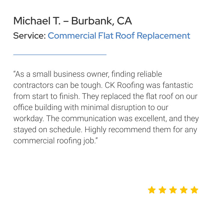 At CK Roofing Company, we provide trusted and professional commercial roofing services in Los Angeles for all types of businesses. Whether you manage a retail space, office building, warehouse, or apartment complex, we offer roofing solutions that are reliable, cost-effective, and built to last.